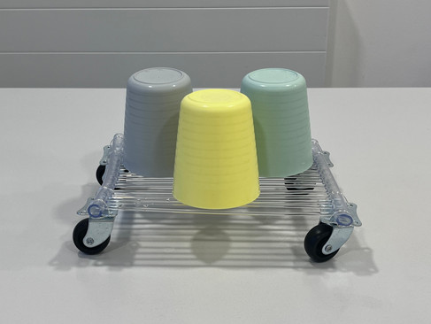 For the first production I chose to use the round plastic ring that I had used to wrap the copper wire around as a wheel, but when I placed the cup on the shelf I found that it did not slide smoothly. Therefore, I chose to replace the plastic ring with a whell in order to achieve a smooth sliding motion.